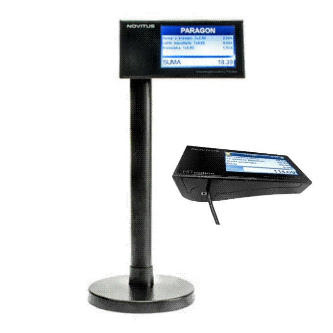 Wyświetlacz dedykowany do współpracy z kasą NEXT oraz NEXT Online. Jest to wyświetlacz LCD na podstawie. Obszar wyświetlania: 4,3 cala, kolorowy. Wysokość całego wyświetlacza to 37 cm (na zamówienie może być dowolna wysokość podstawy lub jedynie miejsce na zamontowanie wyświetlacza do własnego uchwytu/zabudowy). Wyświetlacz łączony jest do kas przewodem RS232 (wtyk RJ45) o długości ok. 1,25 m (nadmiar przewodu można schować w podstawie wyświetlacza).