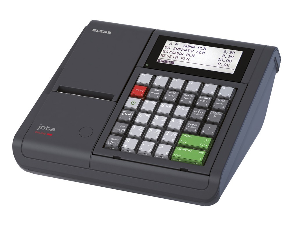 Kasa ELZAB Jota ONLINE to niezawodna kasa fiskalna wyposażona w trwałą klawiaturę mechaniczną oraz 4-liniowy wyświetlacz kasjera. Konstrukcja oparta o sprawdzone, zaawansowane rozwiązania systemowe modelu ELZAB Jota z kopią elektroniczną. Przeznaczona do pracy w sklepach spożywczych, mięsnych, cukierniach, piekarniach, małej gastronomii, szczególnie tam, gdzie możliwa jest praca w sieci LAN/WAN. Posiada podtrzymanie akumulatorowe, może również pracować zasilana z gniazdka zapalniczki samochodowej.