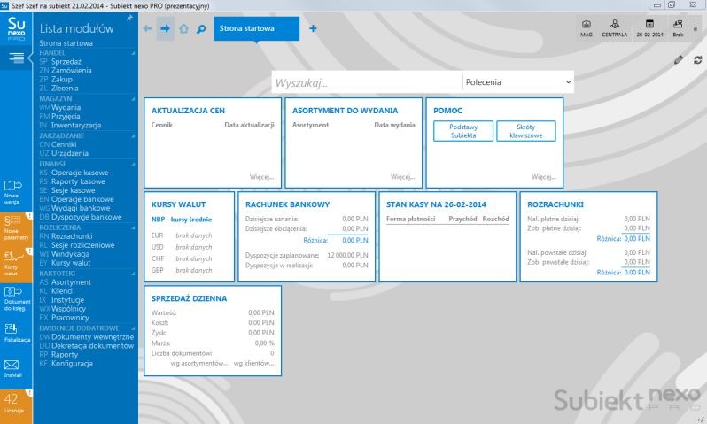 Subiekt nexo to program kompleksowo wspomagający obsługę sprzedaży w małych i średnich firmach – sklepach, hurtowniach, warsztatach, zakładach usługowych itp. Przyjazny, intuicyjny interfejs ułatwia i przyspiesza pracę, a bogata funkcjonalność zaspokoi potrzeby nowoczesnych przedsiębiorców, bez względu na branżę.