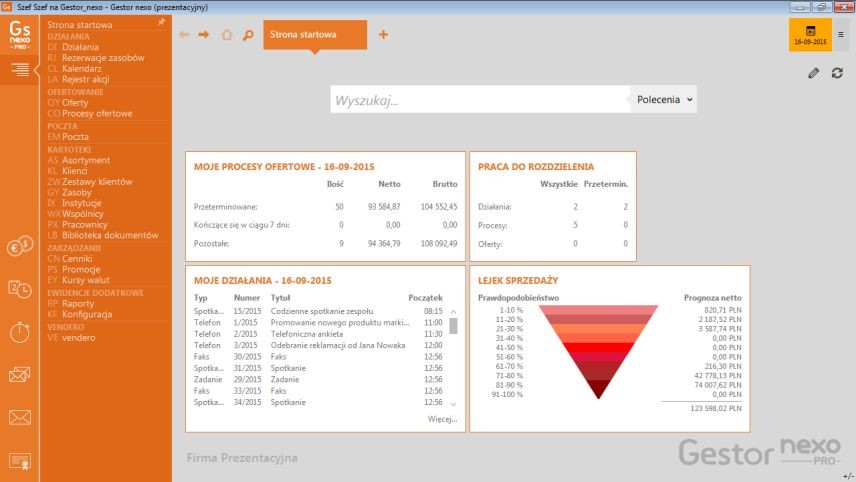 Gestor nexo umożliwia m.in: ewidencjonowanie szczegółowych danych klientów wraz z historią kontaktów, przedstawianie i negocjowanie ofert oraz prowadzenie korespondencji mailowej czy zbiorczą wysyłkę maili za pomocą wbudowanego klienta pocztowego. Działa również w obszarze wewnątrzfirmowym, organizując i usprawniając pracę – pozwala planować wykonanie zadań wraz z delegowaniem ich na pracowników, monitorować postępy w wykonywaniu prac, rezerwować ogólnodostępne zasoby w firmie (np. pojazdy służbowe).