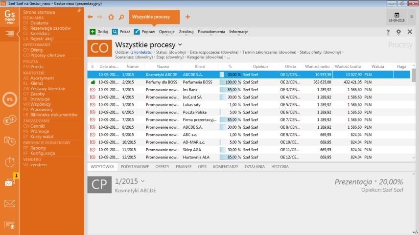 ewidencjonowanie historii kontaktów z klientem, wykonanych działań z jego udziałem, przedstawionych ofert i procesów ofertowych, wystawionych dokumentów handlowych;